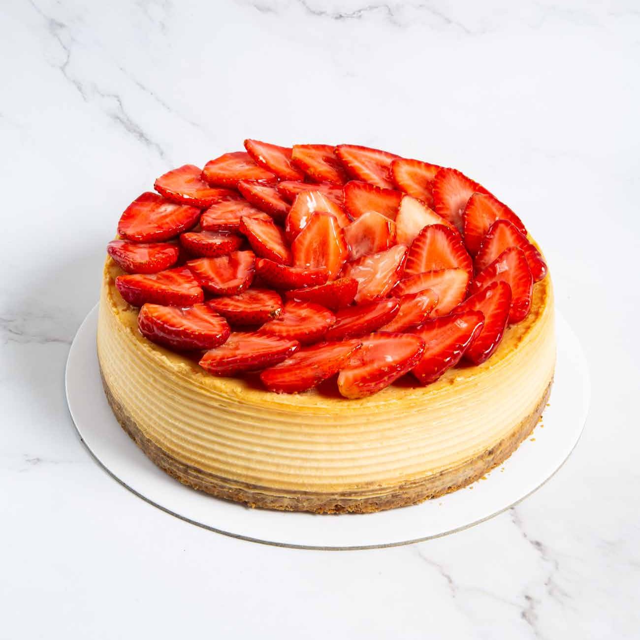 Suave torta de queso crema horneada lentamente, cubierta con frutos rojos.