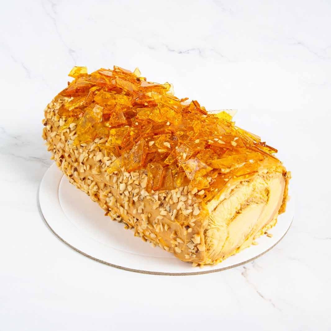 Enrollado de bizcocho relleno con manjar hecho en casa y crema de lúcuma o chirimoya, cubierto con caramelo crocante.